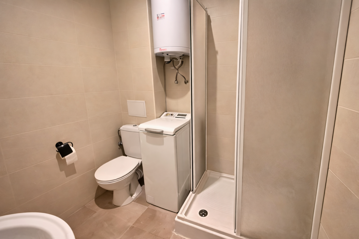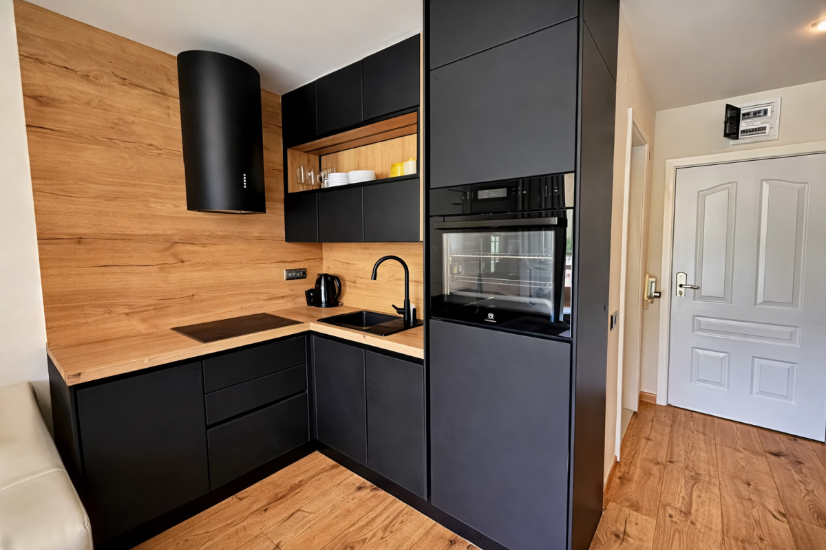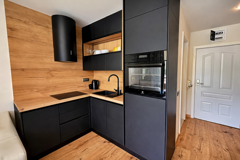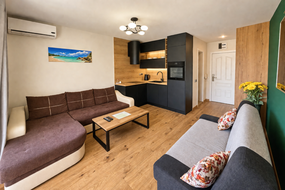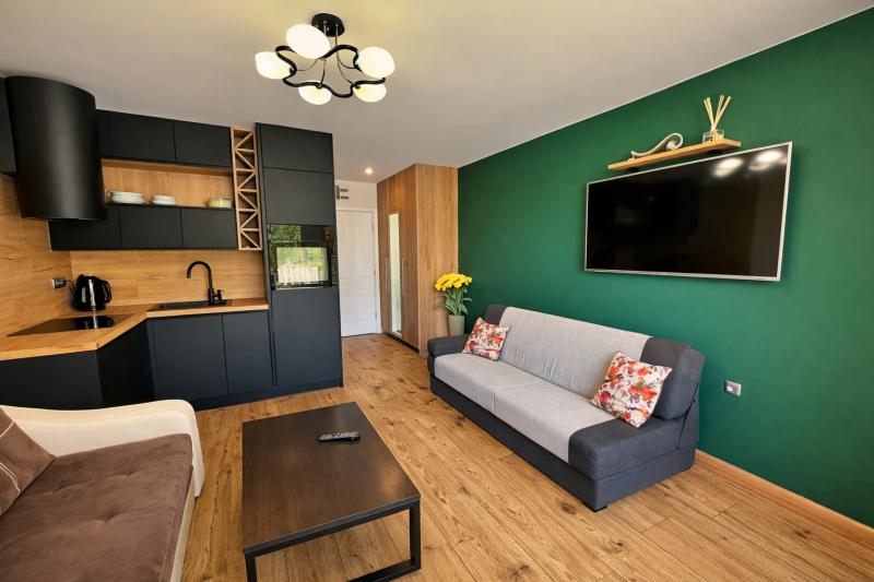 Wnętrze zostało zaprojektowane z myślą o wygodzie – znajdziesz tu część dzienną z rozkładanymi sofami, aneks kuchenny oraz bezpośrednie wyjście na prywatny taras.