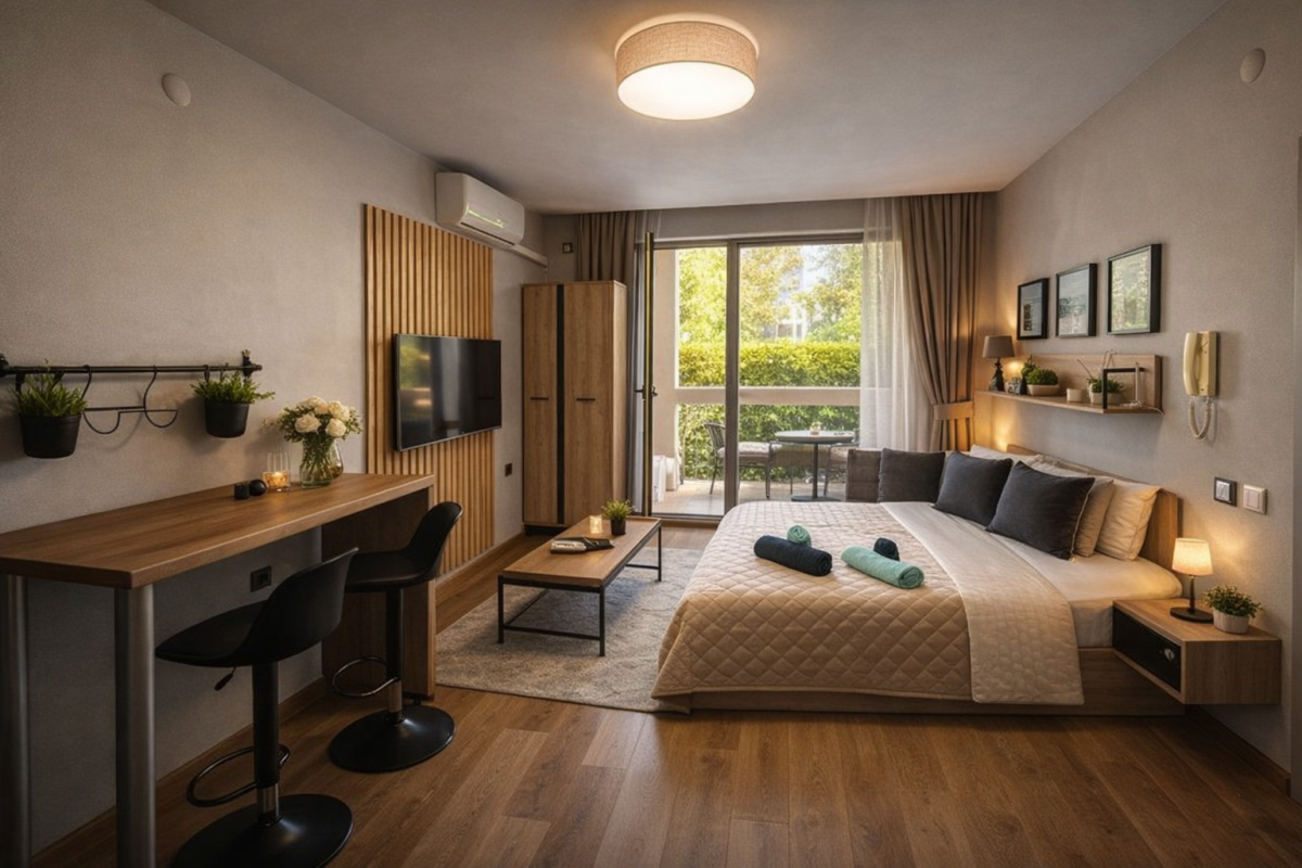 Masz szansę na wspaniałe wakacje, w apartamencie usytuowanym na drugim piętrze prestiżowego kompleksu Prestige Fort. Studio charakteryzuje się przemyślanym i nowoczesnym wnętrzem, w które skład wchodzi m.in. salon z aneksem kuchennym.. Dodatkowym atutem jest stylowy balkon z widokiem na okolicę. Szary odcień ścian dodaje mieszkania elegancji, a łóżko oraz meble kuchenne nawiązują kolorystyką do barw wystroju – co tworzy spójny i przyjemny dla oka obraz. Oferowane studio jest świeżo po remoncie i zaopatrzone w meble o wysokim standardzie.