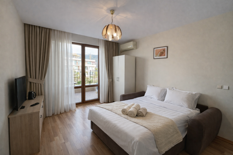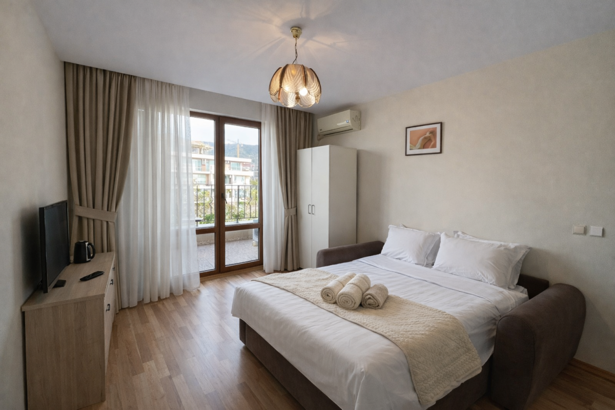 Szukasz komfortowego noclegu w świetnej lokalizacji nad Morzem Czarnym? To studio w Sveti Vlas w kompleksie Prestige Fort to idealna propozycja dla osób, które chcą spędzić wakacje w spokojnym, eleganckim kurorcie – tuż przy piaszczystej plaży.